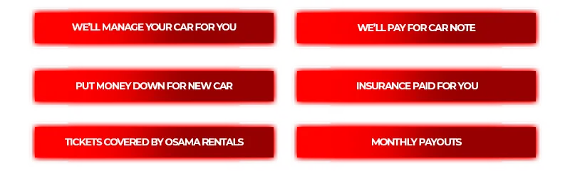 If you already have a car we will take over the car note if the payment is not outrageous, if so we will take over note and Osama Rentals will keep 100% earnings from car.